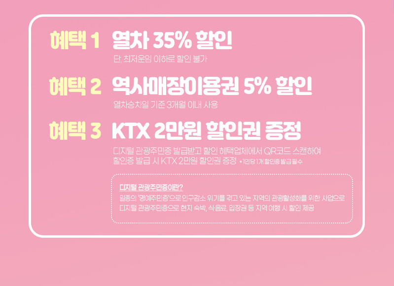 - KTX 2만원 할인권 증정 (디지털 관광주민증 이용 필수)