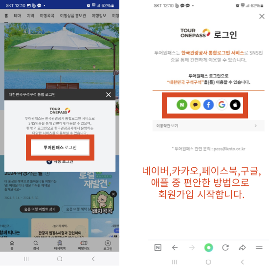 ▶투어원패스 로그인화면이 보입니다. [네이버,카카오,페이스북,구글 애플] 중 편안한 방법으로