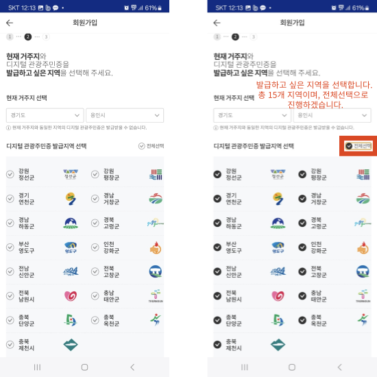 ▶현재 거주시를 선택하고, 희망하는 디지털 관광주민증 발급지역을 선택합니다.