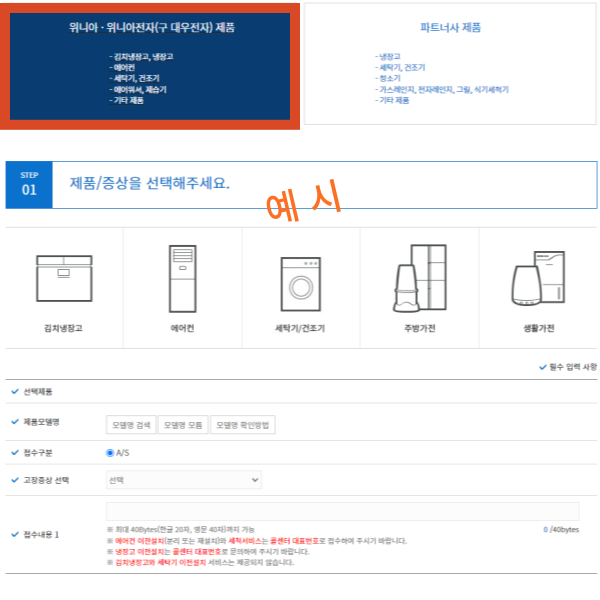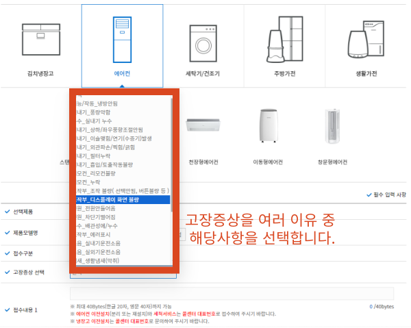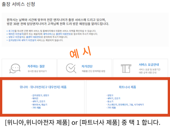- 출장 서비스를 이용하기 위해서는 제품모델을 찾아 선택한 후 고장 증상을 정확히 입력한 후 신청합니다.
