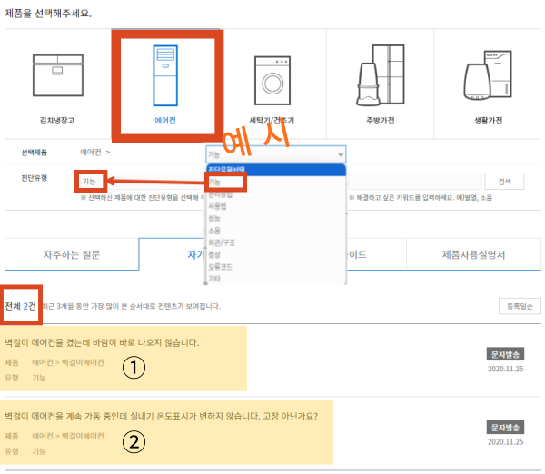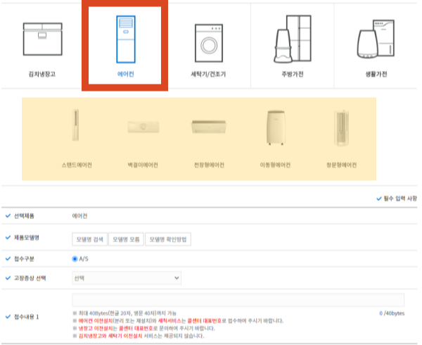 - 자가진단을 위한 제품유형 중 에어컨을 선택했습니다.
