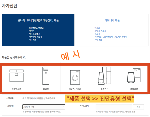 - 위니아 제품 중 [김치냉장고/에어컨/세탁기, 건조기, 주방가전, 생활가전] 중 해당제품을 선택합니다.(예시화면)