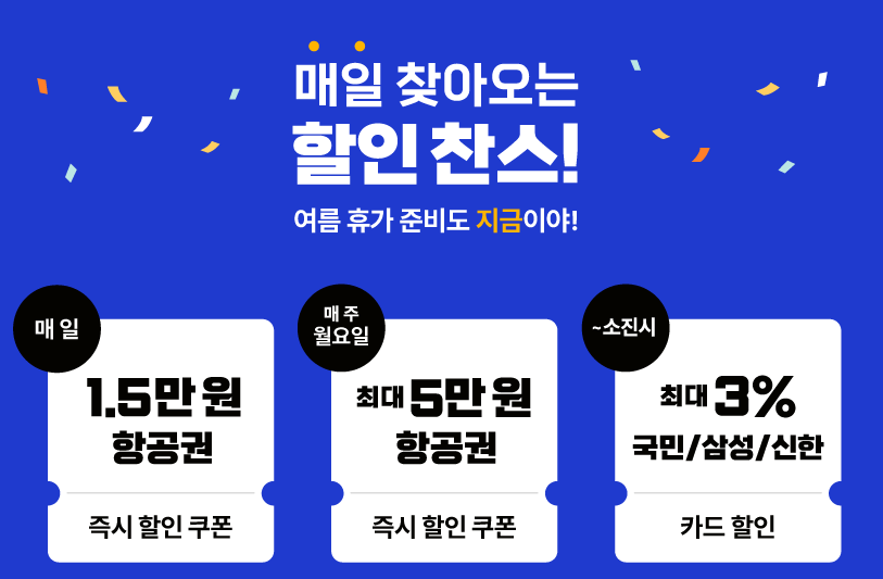 여름 여행을 계획하고 계신다면 이번 항공권, 호텔, 렌터카 등 다양한 여행 상품을 저렴한 가격에