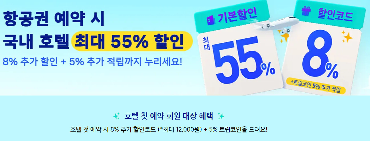 ◈호텔 쿠폰 : 최대 55% 할인 + 할인코드 8% + 트립코인 5% 추가