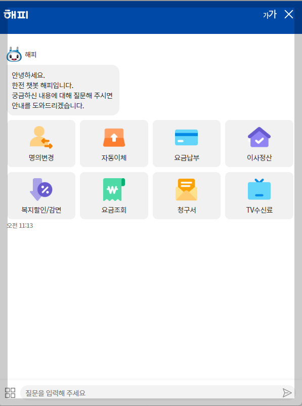 이 기능을 통해 전기 고장 신고, 전기요금 조회, 청구서 변경 등 다양한 문의가 가능합니다.