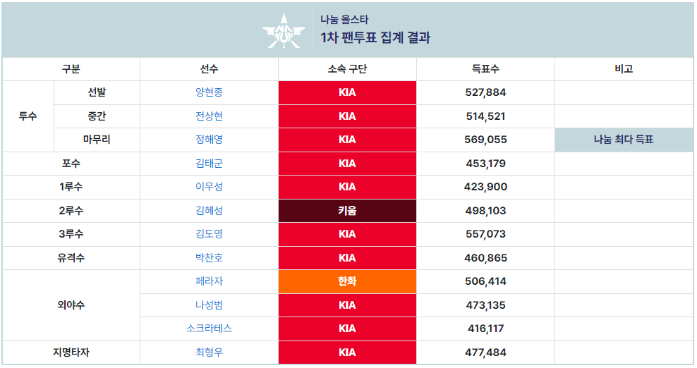 1차 중간집계결과 나눔 올스타팀은 KIA가 가장 많은 10개부분을 차지했습니다.