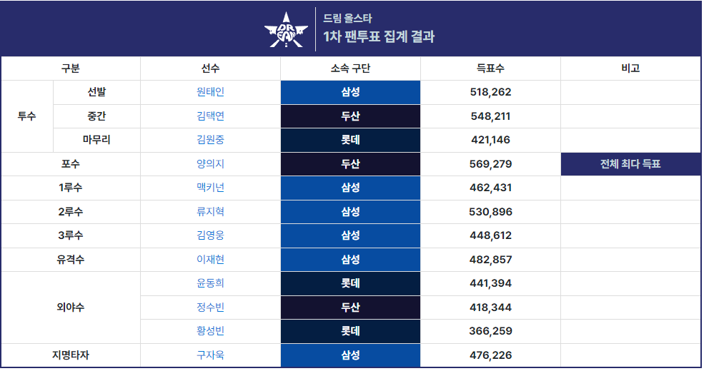 ※ 1차 중간 집계 결과 드림 올스타팀은 삼성,두산,롯데가 모든 분야를 나눠가졌으며,