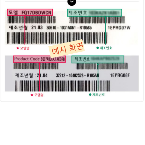 제품 전면에 부착되어있는 라벨을 확인하면 모델명과 제조번호를